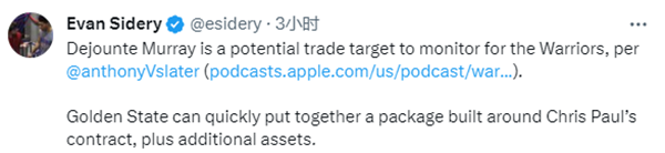 保罗养伤期间陷入交易流言,勇士跟队记者Anthony Slater在节目中表示,老鹰后卫德章泰-穆雷是勇士的一个潜在交易目标。勇士能送出的打包方案将会是以保罗为主体加上其他的资产。
