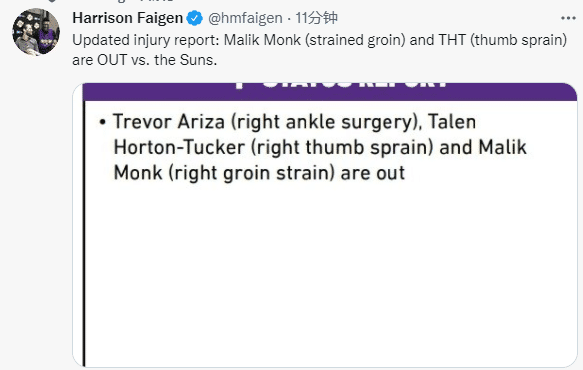 来源:24直播网10-10 11:1124直播网10月10日讯 ,洛杉矶湖人队最新伤病报告出炉,据名记Harrison Faigen报道,明天对阵太阳,除了阿里扎(右脚踝清创手术)之外,塔克和蒙克也将缺席本场比赛,塔克遭遇右手拇指扭伤,蒙克则是遭遇右腹股沟拉伤。