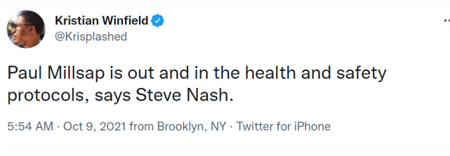 对于篮网来说,欧文能够回来训练是喜,但他们也有忧。纳什确认,36岁老将米尔萨普因健康安全协议缺席今日比赛。此前,凯尔特人宣布杰伦-布朗新冠检测呈阳性,因健康安全协议缺席比赛。米尔萨普的缺阵,暂不知道是否与本人新冠检测结果有关,但他触发健康安全协议,可能要有一段隔离的时间。