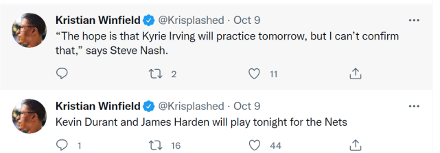 篮网官方也在今天进行赛季倒计时:11天,配上了欧文身穿11号球衣的照片。此前的球票销售海报上,欧文的位置被布朗替代,如今他再次出现在官方的动态中,也算是一个积极的信号。