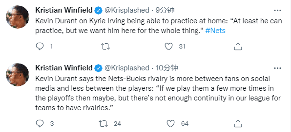 篮网和雄鹿赛后,杜兰特回应欧文获准归队参加训练,他表示:至少他还可以训练,但我的意思是,我们希望他能参与一切,我们希望他能打比赛,能出战主场比赛、训练、客场比赛、投篮训练,所有的一切。所以,希望我们能解决这事。