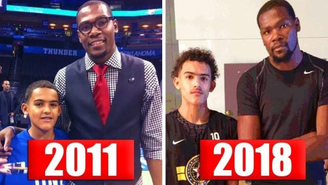 比如特雷-杨,他就曾在2011年与杜兰特合影过,当时的他还只有13岁。2018年,特雷-杨以5号秀的身份进入NBA打球,再次合影杜兰特,时隔7年,昔日的偶像已经成为今日的对手。
