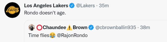 布朗晒出这两张合影时,还艾特了朗多,配文写道:“时光飞逝。”而湖人官方也转发了布朗的动态,配文写道:“朗多不会变老。”是的,这或许也是很多球迷心中的感觉,眼前的朗多,似乎多年来总是一个模样,并没有变老的感觉。