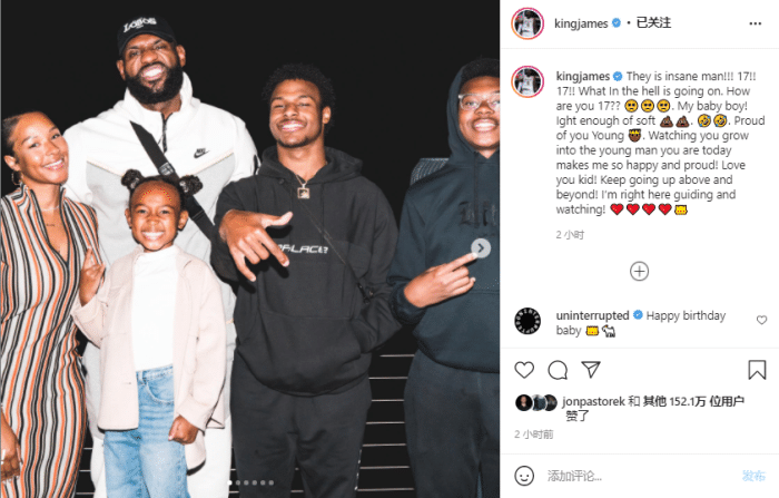 詹姆斯晒照并且配文:这太疯狂了啊!17岁!17岁!到底在发生什么事。你怎么都17岁了呢???好吧,不再多说让人心软的话了。为你骄傲,年轻的国王。看着你长成如今的小伙子让我如此快乐和自豪!爱你,孩子!继续不断攀升吧!我就在这里指引着你,注视着你!