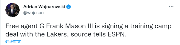 梅森是湖人季前赛阵容中的第20名球员,大名单满员,他有望为湖人出战季前赛,不过湖人队已经有14份保障合同球员,预计季前赛结束后,梅森又要失业了。