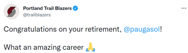 开拓者官媒写道:“祝贺加索尔退役,多么令人赞叹的职业生涯!”