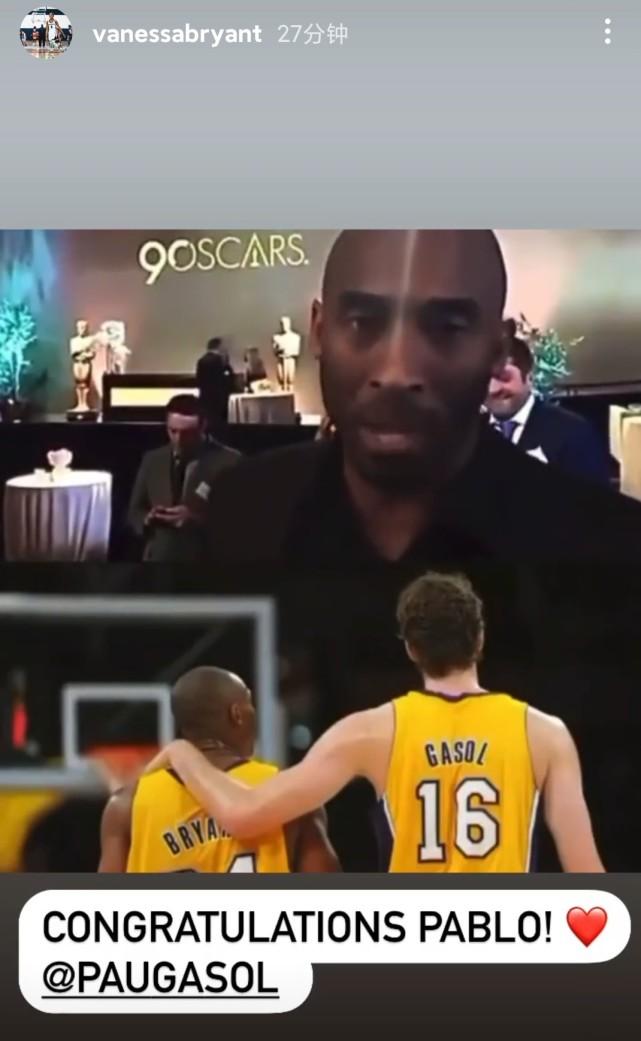 科比遗孀瓦妮莎转发了大加索尔正式退役的消息,并送上真挚的祝福。就像大加说的那样,很遗憾科比未能见证这一幕。或许是为了弥补这一遗憾,瓦妮莎晒出了一段科比在奥斯卡颁奖礼上的采访。在那段采访中,科比提到了大加索尔。