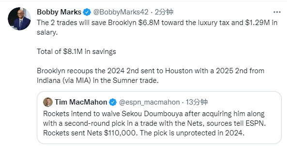 据薪资专家bobby marks报道,这两笔交易将为布鲁克林节省 680 万美元的奢侈税和 129 万美元的工资。 总共节省了810万美元 ;篮网队把2024年二轮选秀权交易到火箭,从步行者得到2025年二轮选秀权;通过这两笔操作,相当于篮网换了一个选秀权并且剩下810万美元。