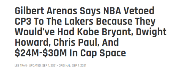 “问题就在于当时的湖人打造一支超级球队,还能剩下不少薪金空间。这就是这笔交易被叫停的原因,马克-库班为首的那些人非常不满,而这笔交易打造的阵容本可以摧毁联盟至少10年。”