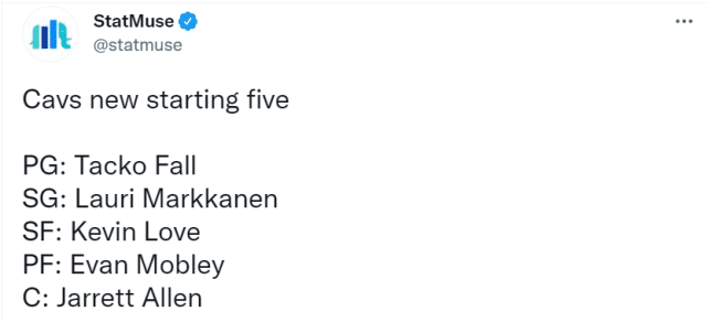 法尔的到来,无疑会进一步提升骑士的阵容身高。数据网站StatMuse调侃:骑士新赛季的首发阵容是:控卫法尔、分卫马尔卡宁、小前乐福、大前莫布里、中锋阿伦。这当然只是调侃,但也说明了骑士目前阵容的内线高度有多么恐怖。