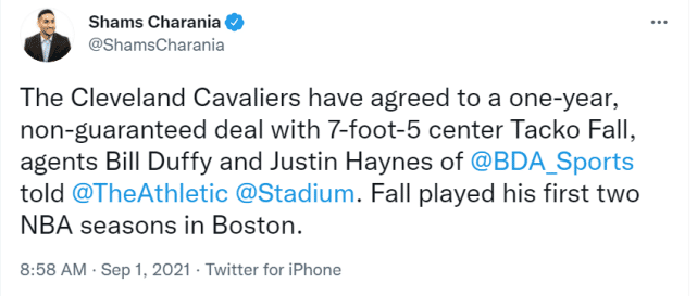 来源:24直播网09-01 15:0724直播网9月01日讯 ,据名记查拉尼亚报道,克里夫兰骑士已经和身高7英尺5英寸(2米26)的中锋塔科-法尔签下一份1年无保障的合同。法尔的经纪人达菲和海恩斯确认了这一消息。法尔前两个赛季效力于凯尔特人,如今,他将在骑士开启职业生涯的新篇章。
