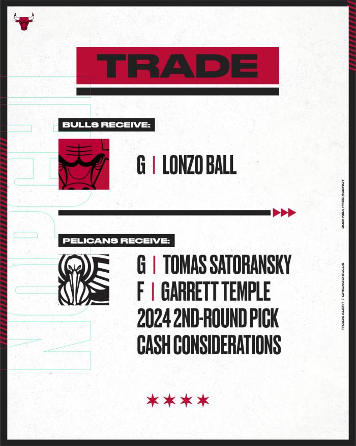 17年榜眼郎佐-鲍尔正式加盟公牛,新赛季改穿公牛2号球衣,联手拉文、德罗赞和武切维奇冲击季后赛;鲍尔拿到一份4年8500万美元大合同,最后一年拥有球员选项;鲍尔第一时间转发加盟公牛的官方推文。