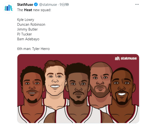 美媒StatMuse列出热火新赛季首发五虎——洛瑞、邓罗、巴特勒、塔克和阿德巴约,希罗担任球队第六人;这样的热火将会成为联盟最好的防守球队之一;上赛季首轮被雄鹿了4-0横扫,新赛季热火打造一支铁军冲击总冠军,接下来莱利还会有更多的操作。