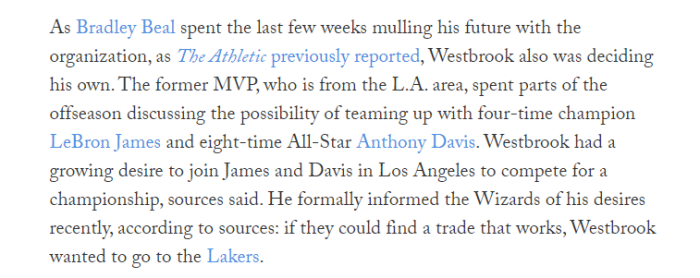 威少不满奇才的操作并且一心想要加盟湖人,而湖人正想引援一位精英级别的控卫,他们认为威少可以胜任这个角色,因此湖人积极推动并且很快就和奇才完成交易;对于威少离队,比尔表示没问题,他会继续留在华盛顿的。