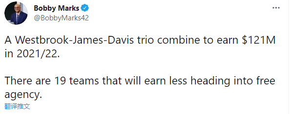 湖人打造超级三巨头,詹姆斯、浓眉和威少三巨头下赛季年薪高达 1.21亿美元,目前联盟有19支球队的总薪资低于湖人三巨头的年薪。