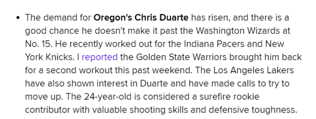 Wasserman报道称,杜阿尔特的预测顺位是首轮第15位,他应该掉不出第15位。最近,杜阿尔特为步行者和尼克斯试训过,勇士也在上周末第二次试训杜阿尔特,这位24岁的年轻人具备非常出的投射能力,防守强度也很不错,是3D即战力,引起多支球队的兴趣。