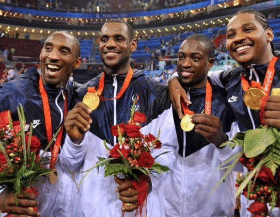 进入联盟一年的詹姆斯,便有幸参加了04年的雅典奥运会。当时梦之队的核心是艾弗森和邓肯。他们在半决赛中败给了吉诺比利带领的阿根廷,詹姆斯的第一场奥运会之旅,便以一块铜牌而草草结束了。詹姆斯步入巅峰参加奥运会当属2008年,当时美国队用的是詹姆斯+科比双核战术。那年的韦德状态神勇,替补出席拿到了队内的得分王。科比在与西班牙的总决赛中,更是3+1彻底扑灭了西班牙的追分势头。同样,詹姆斯的表现也不遑多让!