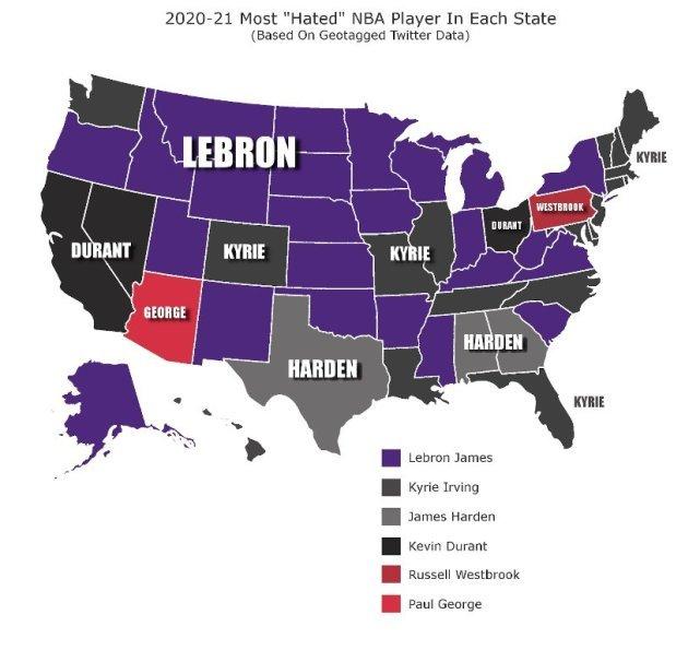 在这份排名中,湖人队球星勒布朗-詹姆斯高居第一,他在24个州都是最不受欢迎的球星,而篮网球星欧文的招黑能力仅次于詹姆斯,他在全美18个州都是最不受欢迎的球星。哈登和杜兰特并列第三,乔治和威少并列第五。