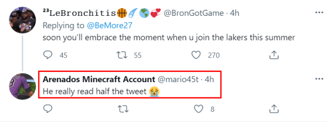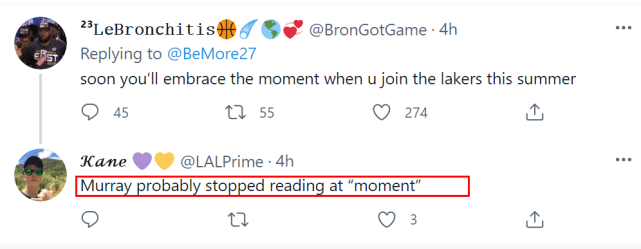 穆雷真的有意愿加盟湖人?恐怕只是他的眼花+手滑。很快有球迷调侃穆雷的点赞,只是失误而已。一个球迷写道:“他真的只读了一半的句子。”另一个球迷更具体:“他只是读到‘moment(时刻)而已’。”换言之,穆雷看到的应该只是“很快你也将拥抱这样的时刻”。心里也有夺冠梦想的穆雷,自然第一时间点赞这一评论,很可能遗漏了后面加盟湖人的内容。