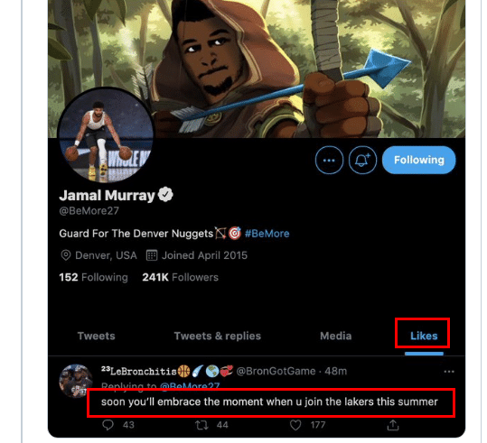 穆雷很快取消了自己的点赞,但球迷的截屏已经引起热议。湖人一些媒体账号已经迫不及待地为穆雷PS上了湖人27号球衣,美媒clutchpoints调侃道:“湖人球迷今晚能做个好梦了。”