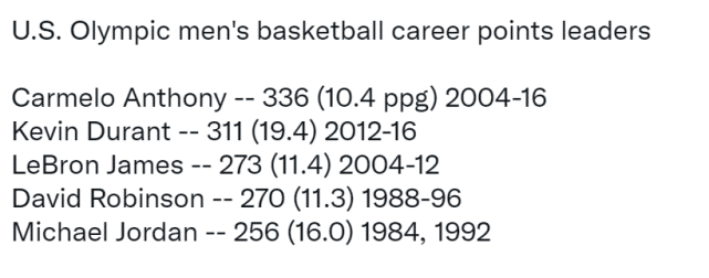 杜兰特还有望在这次奥运会上成为美国男篮的历史第一得分手。数据显示,杜兰特目前排在美国男篮奥运得分榜的第二位。安东尼目前总计为美国奥运男篮拿到336分,杜兰特是311分,他只要再拿26分,就将超越安东尼。詹姆斯273分排名第三,大卫-罗宾逊270分排名第四,迈克尔-乔丹256分位居第五。