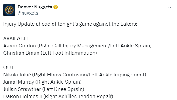 据悉,穆雷在比赛开始前2个多小时就和助教一起进行训练,但他因脚踝伤势移动困难,最终确定继续休战;三届MVP约基奇则是正在处理左脚踝和右手肘部挫伤的问题;掘金两大核心因伤连续缺战勇士和湖人,上一场掘金残阵击败勇士,戈登轰下38分和威少三双立功。