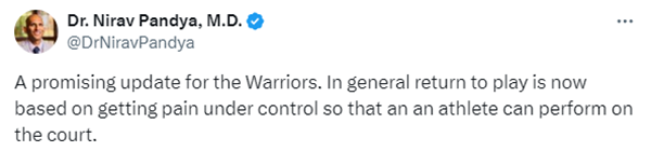 库里意外受伤,所幸骨盆没有摔骨折,医学专家Nirav Pandya表示勇士队的最新情况令人鼓舞,总体而言,重返赛场的前提是控制疼痛,以便运动员能够在球场上发挥;另一医学专家表示这种伤病一般缺席7-10天。