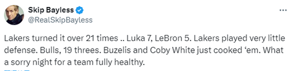 对于湖人惨败,名嘴Skip评论道:湖人失误了21次,东契奇7次,勒布朗5次,湖人没有防守。公牛投进了19个三分,布泽利斯和科比-怀特把湖人打爆了。对于一支完全健康的球队来说,这是一个多么遗憾的夜晚。