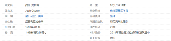 约什-奥科吉(Josh Okogie),1998年9月1日出生于尼日利亚拉各斯(Lagos, Nigeria),拥有尼日利亚/美国双重国籍,尼日利亚职业篮球运动员,司职后卫,效力于NBA菲尼克斯太阳队。约什-奥科吉毕业于佐治亚理工学院,在2018年NBA选秀中于首轮第20位被明尼苏达森林狼队选中,从而进入NBA。