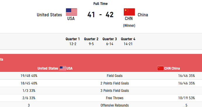 这场比赛中国轮椅女篮赢得非常不容易,要知道的是上半场中国队以7-21大比分落后,只拿下7分,确实陷入到绝境。但下半场中国队完成逆转,她们以1分险胜强敌美国队,继续保持全胜战绩,挺进八强。