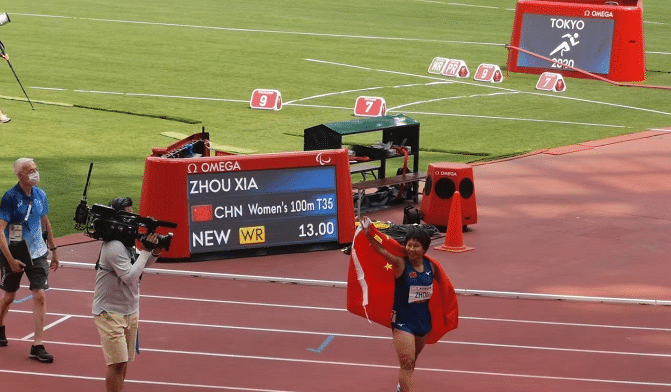随后进行的是女子100米T35级决赛,周霞以13秒的成绩成功卫冕,还打破了残奥会和世界纪录。这场比赛作为霸主的周霞不论是起跑、途中加速还是冲刺,都做得很好,这是一场两个人的战斗,她和澳大利亚选手,对手也打破了世界纪录,不过由于周霞表现的更加好,一直领先一个身位的优势,所以她成功夺冠。这也是周霞的第三枚残奥会金牌,上届残奥会她斩获两金。