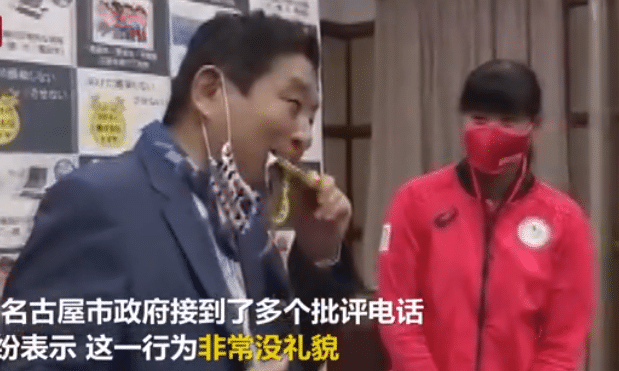 这是赛后的争议,日本女子垒球队选手后藤希友回到名古屋,名古屋市长河村隆之热情接见,之后市长把金牌挂在自己的脖子上后,居然直接放到嘴里咬了一口。争议就此发生,不少人抨击:“好恶心,把别人的金牌放自己嘴里咬,神经病到了一定程度”。