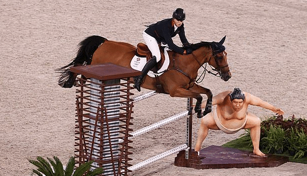 东京奥运马术赛场,一个大型逼真的相扑雕像让,参赛选手担心赛马看到后会受到惊吓,还有多名参赛者抱怨称,这个相扑雕像分散了赛马的注意力,有马被吓到不敢做动作,但没有用,依旧摆在了那里。