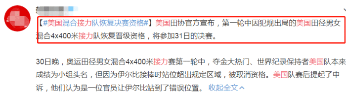 据报道,美国田径队申诉成功,不用参加复赛,直接进入决赛。美国队等于没有成绩,却最终进入了田径决赛,这样的事情,在奥运会历史上太罕见了,美国队犯规反而成了好事,因为不用比就直接进入决赛圈了。