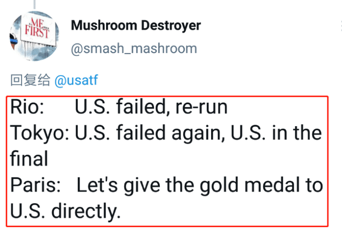 而外媒也讽刺了东道主和美国田径队。第一,里约奥运会,美国队犯规,单独复赛;第二,东京奥运会,美国队犯规,直接进决赛;第三,巴黎奥运会,直接给美国队颁奖吧,还比啥比?