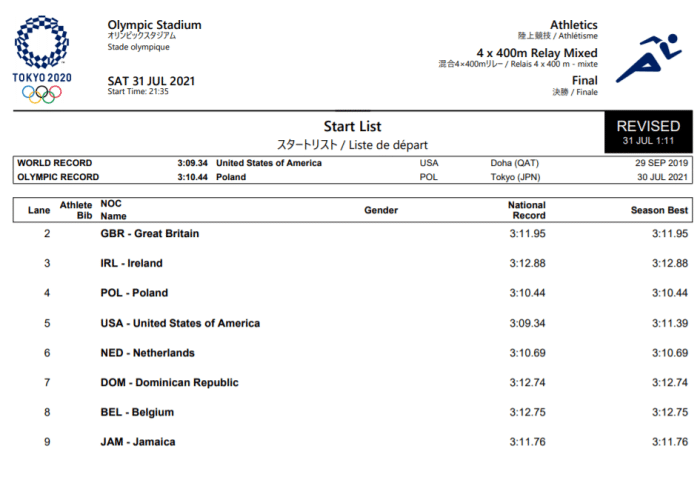 这次4*400米混合接力决赛,美国队小组第一个撞线,但被取消成绩。原因是第二棒接力选手,没有在接力区域接棒。但赛后,美国队申诉说是裁判让站在那里,申诉成功!而且美国直接进入决赛。美国田协首先发布消息,表示美国队已经重新得到了比赛资格,可以参加决赛。