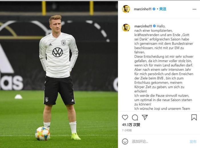 在经历一个复杂的、精疲力尽的赛季之后,我和德国的教练一起决定不参加今夏的欧洲杯。做出这个决定很困难,因为每次被国家队征召都是令我非常自豪的。但是我个人经历了非常紧张的一年,在同多特达成目标后,我决定给我的身体一段时间来恢复。