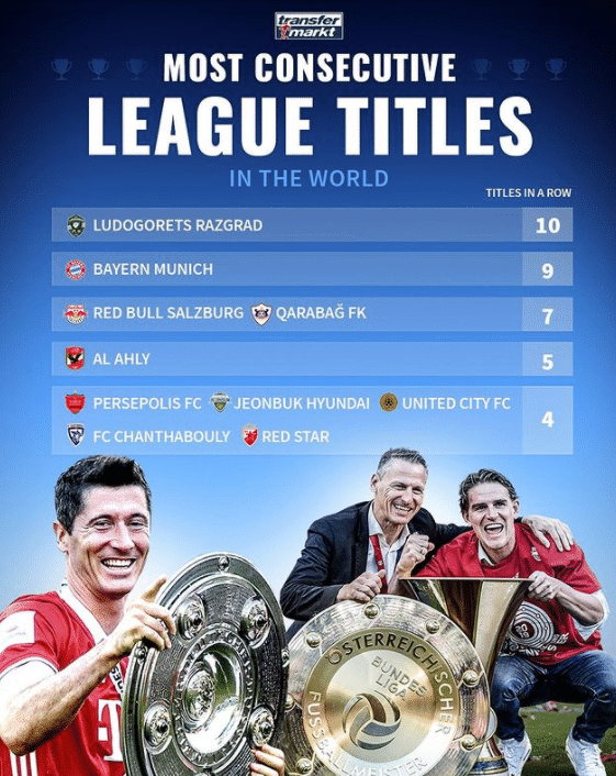 足坛目前各国顶级联赛连冠纪录是保加利亚的卢多戈雷茨,他们曾经在保甲联赛拿到了10连冠,这是世界足坛的纪录。而排名第二的就是拜仁,他们已经拿到了德甲九连冠。而第三的是奥地利联赛的萨尔茨堡红牛和阿塞拜疆联赛的卡拉巴赫,他们都是联赛七连冠。而第五的是埃及的开罗国民,他们拿到了联赛五连冠。随后是伊朗联赛的波斯波利斯、韩国联赛的全北现代、菲律宾联赛的联城、老挝联赛的丰田和塞尔维亚联赛的贝尔格莱德红星,他们都拿到了四连冠。