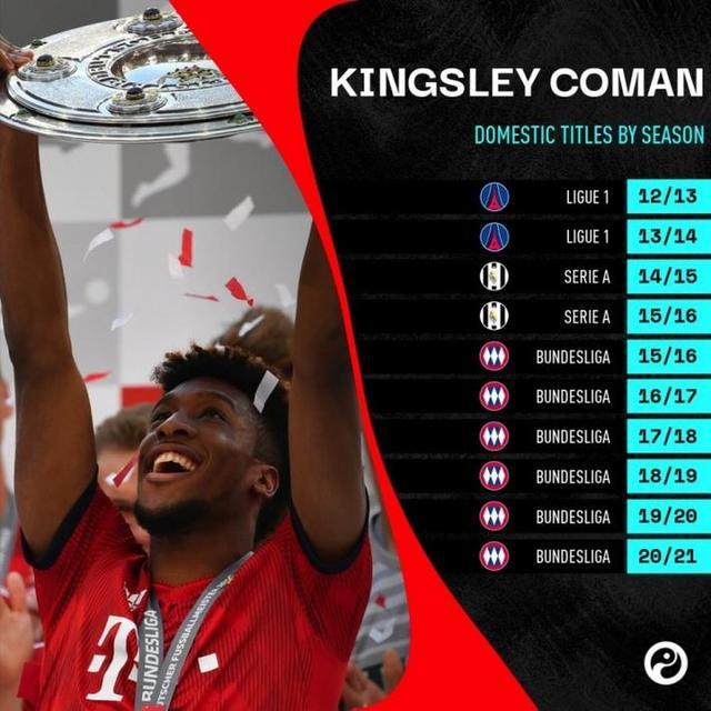 金斯利-科曼收获了自己第6座德甲冠军,值得一提的是,这也是科曼个人在联赛的9连冠。9年间未曾错过任何一座联赛冠军,实属人生赢家。