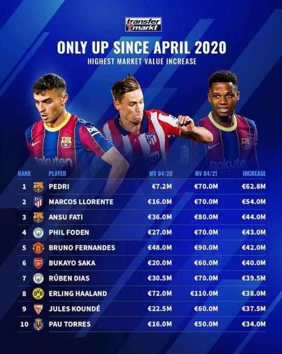 近一年球员身价涨幅榜: 佩德里涨6280万欧居首