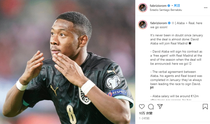 据悉阿拉巴和经纪人在今年1月就和皇马达成了口头协议,在西班牙踢球是他的梦想。他将作为自由球员和皇马签约。