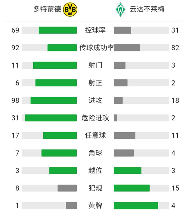 伤停补时2分钟。全场比赛结束,多特蒙德4-1逆转不莱梅,目前积49分距离欧冠区4分。