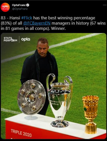 根据Opta数据统计,在执教拜仁期间,弗里克的胜率高达83%(81场比赛赢下67场),这个胜率位列拜仁队史所有教练中第一。