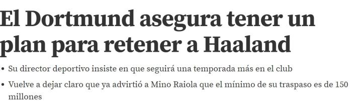 不过,多特蒙德方面表示哈兰德仍在他们的计划之内,大黄蜂体育总监佐尔克表示他们希望哈兰德再留一个赛季,除非俱乐部收到一份无法拒绝的报价,否则他们不会出售这名挪威锋霸。