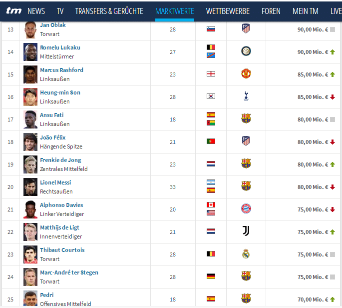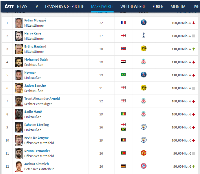 如图,大部分球员的身价都有大幅下跌,不过即便如此,姆巴佩依然排名榜首,他的身价是1.6亿欧元,第二是凯恩的1.2亿欧元,内马尔、哈兰德和萨拉赫并列第三,都是1.1亿欧元。桑乔、阿诺德、马内、斯特林和德布劳内并列第六,他们的身价都是1亿欧元。B费、基米希、奥布拉克和卢卡库并列第11,身价是9000万欧元,而孙兴慜和拉什福德并列第15,身价都是8500万欧元。跟着法蒂、菲利克斯、梅西和德容并列第17,身价都是8000万欧元。