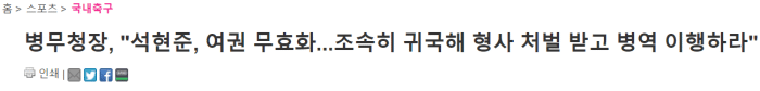 来源:24直播网04-29 10:2424直播网讯 据韩国媒体报道,效力于法乙特鲁瓦的韩国球员石现俊逃兵役,被外交部被取消护照资格,并被韩国兵务厅勒令回国服兵役。