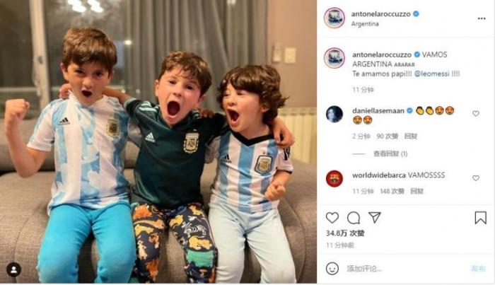 赛后梅西妻子安妞更新Ins,晒出了三个儿子身穿阿根廷庆祝胜利的照片,并写道:“加油阿根廷,我们爱你爸爸!“