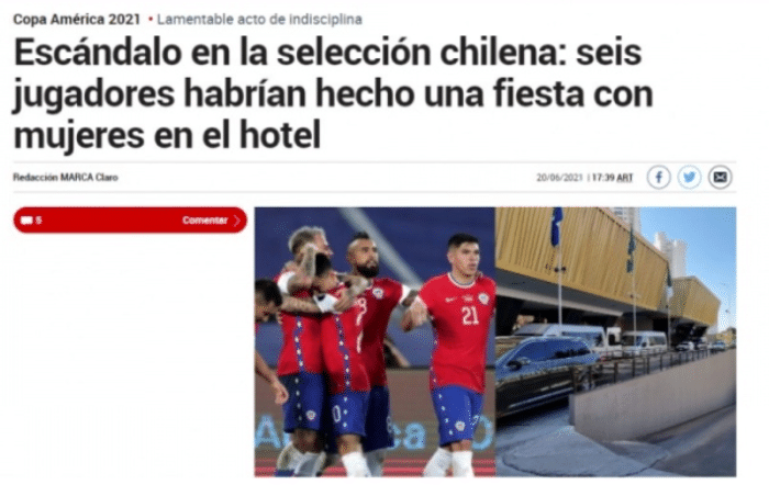 这位记者的爆料得到了《马卡报》和《阿斯报》等西班牙媒体的转发,他称比达尔、梅德尔、巴尔加斯、阿兰吉斯、加尔达梅斯和梅内塞斯六名智利球员在美洲杯期间将妓女带回球队下榻的酒店,违反了防疫规定,现在球队已经停止训练,主帅甚至可能辞职。