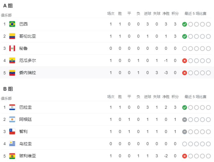 美洲杯积分榜:巴西A组头名,阿根廷B组第二