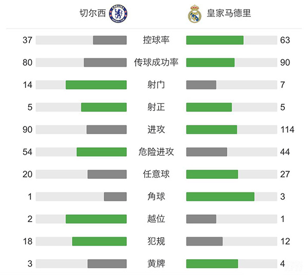 全场比赛结束,切尔西主场2-0战胜皇家马德里。